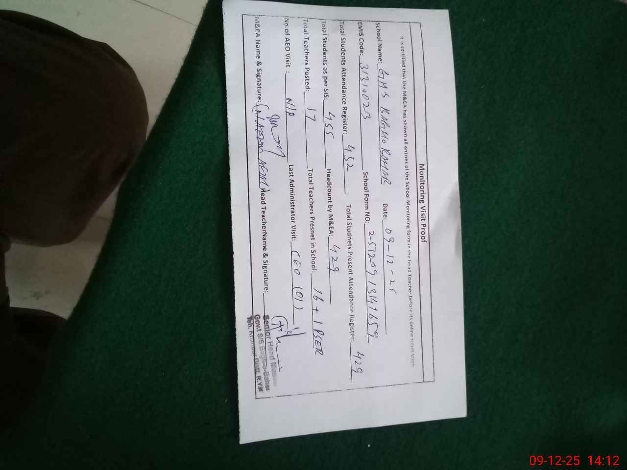| Attendance Register | Head Teacher | MEA with School | Visit Proof |