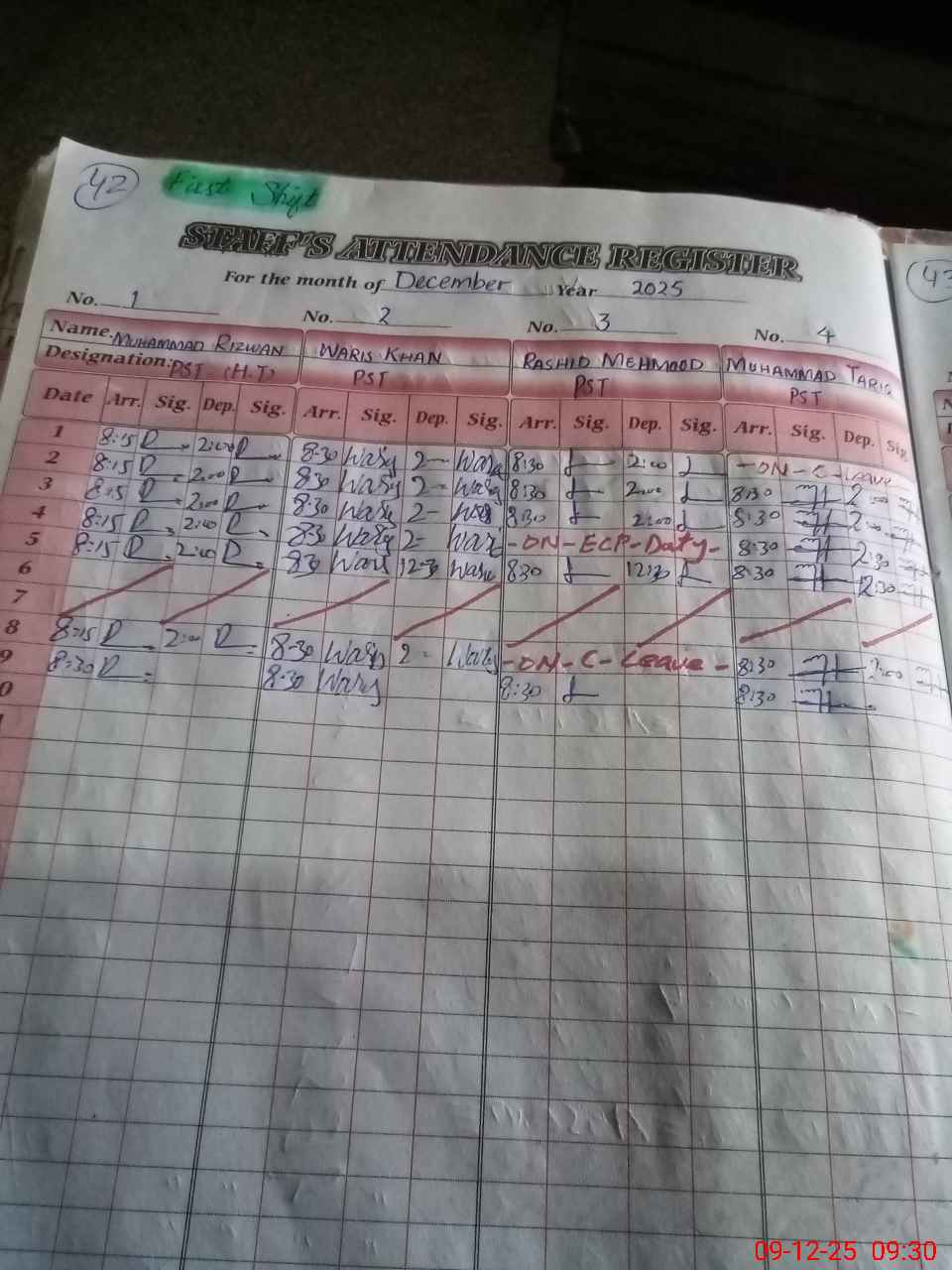 | CNIC | Full Name | Designation | R/C | Absence during last cal. month |