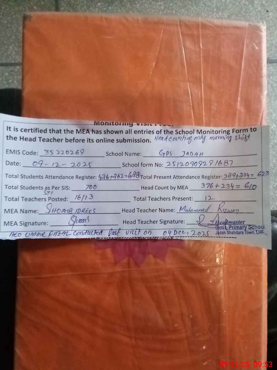 | Attendance Register | Head Teacher | MEA with School | Visit Proof |