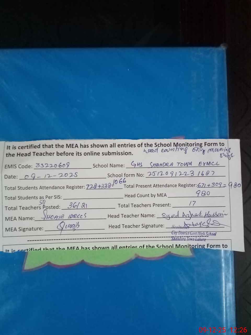 | EMIS Code: 35220609 | Name of School: GHS SHAHDARA TOWN (EX-MCL) | |||