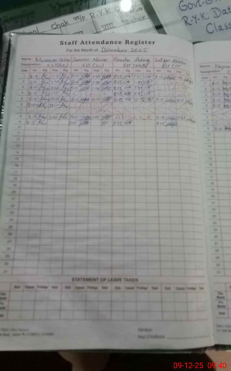 | CNIC | Full Name | Designation | R/C | Absence During Last Calender Month |