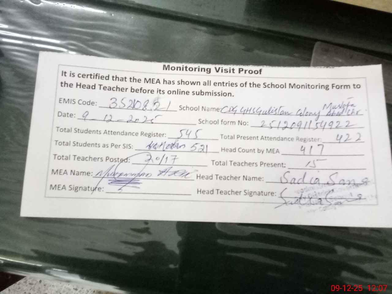 | EMIS Code: 35210821 | Name of School: GGHS GULISTAN COLONY MUSTAFA ABAD (EX-MCL) | |||