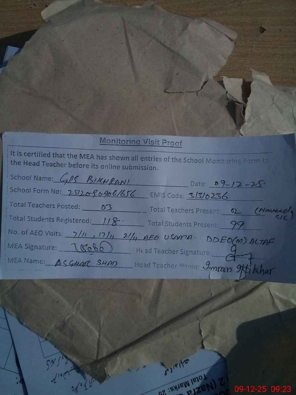 | Attendance Register | Head Teacher | MEA with School | Visit Proof |