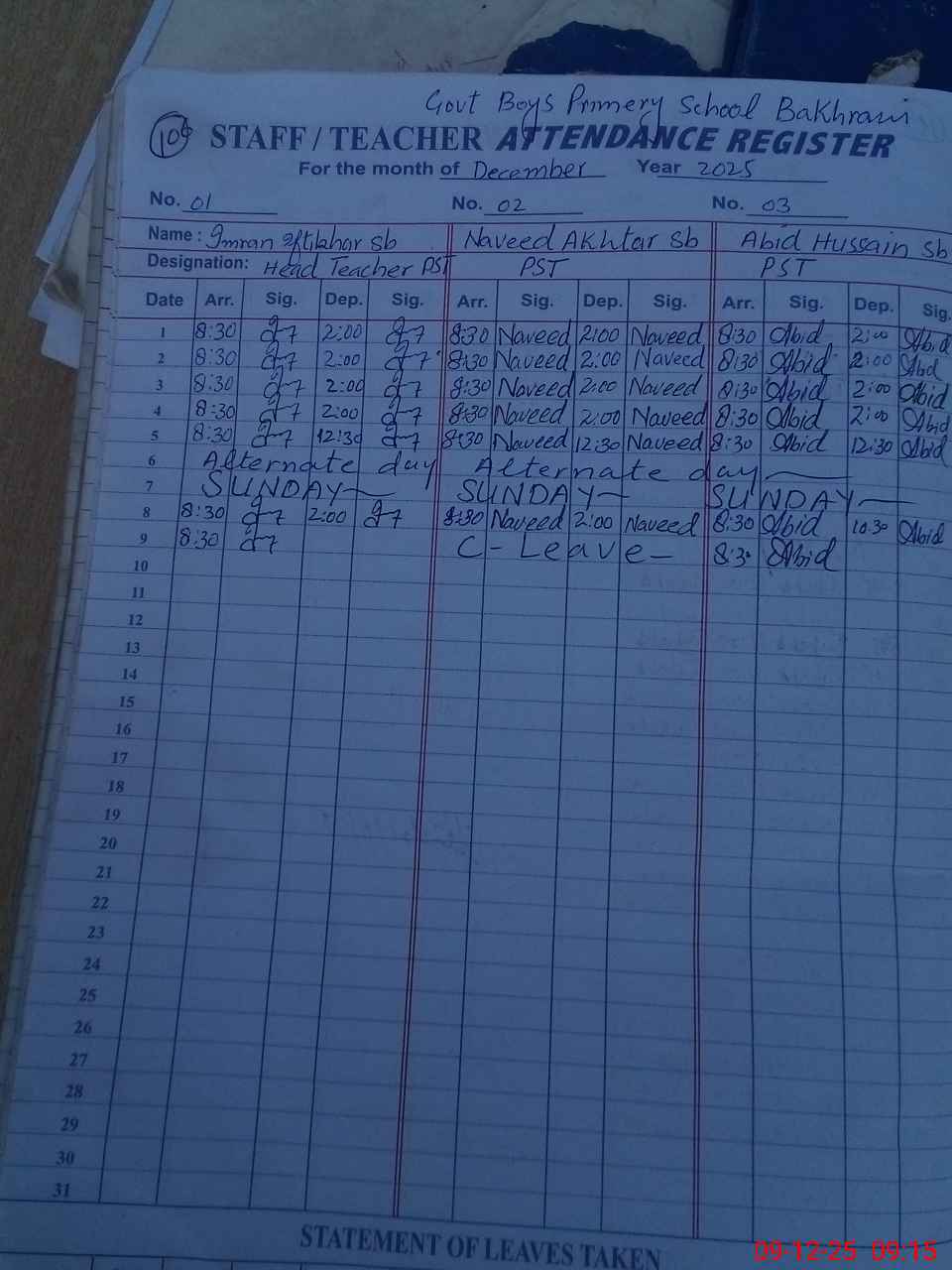 | CNIC | Full Name | Designation | R/C | Absence During Last Calender Month |
