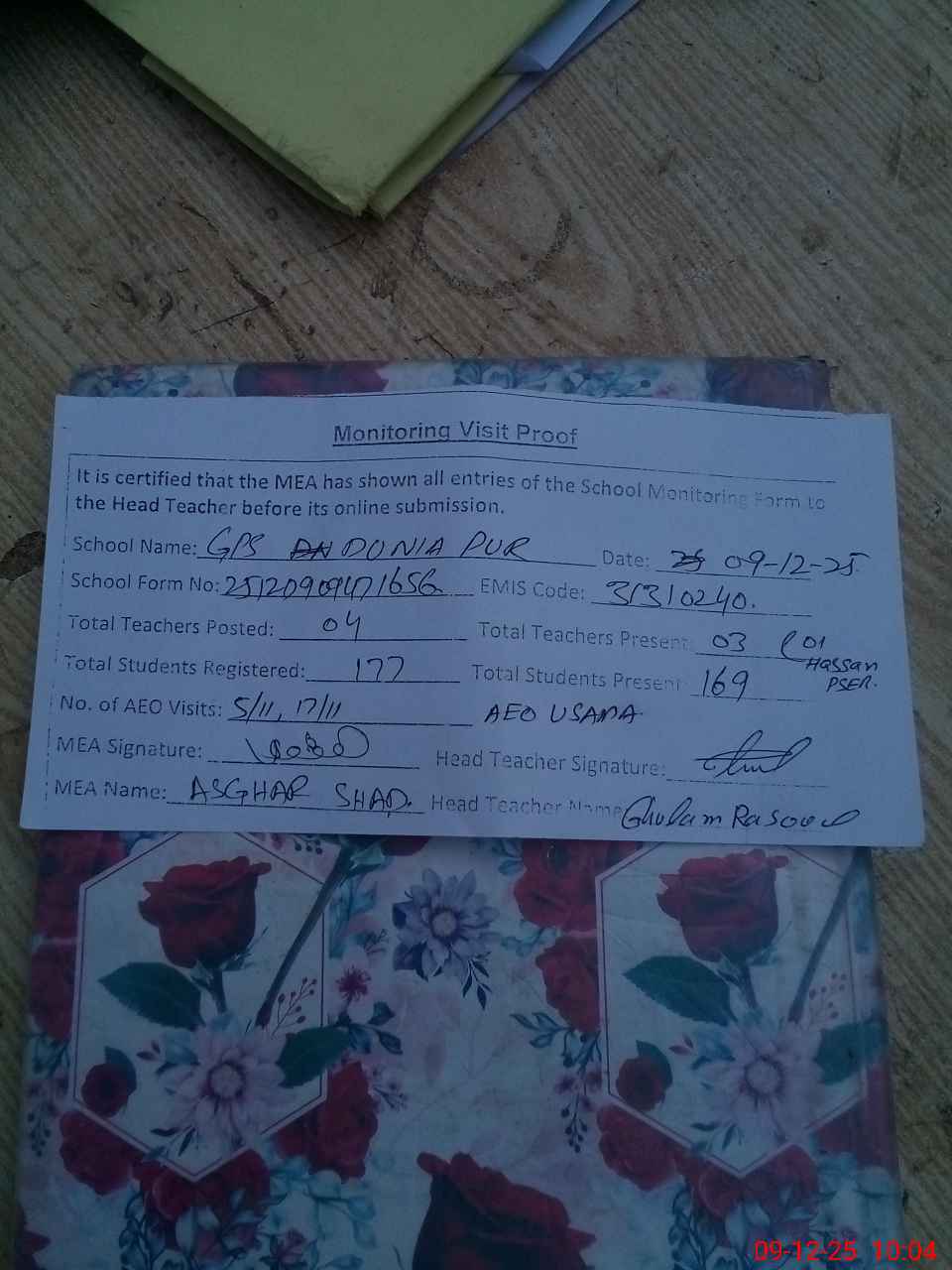 | EMIS Code: 31310240 | Name of School: GPS DUNIA PUR | |||