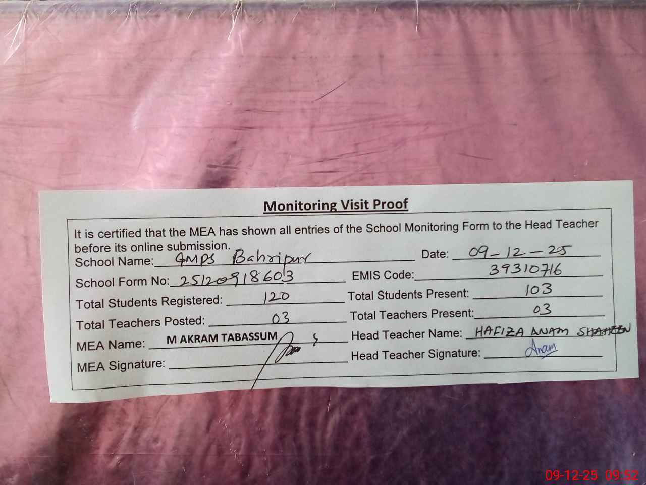 | EMIS Code: 39310716 | Name of School: GMPS BAHRI PUR | |||