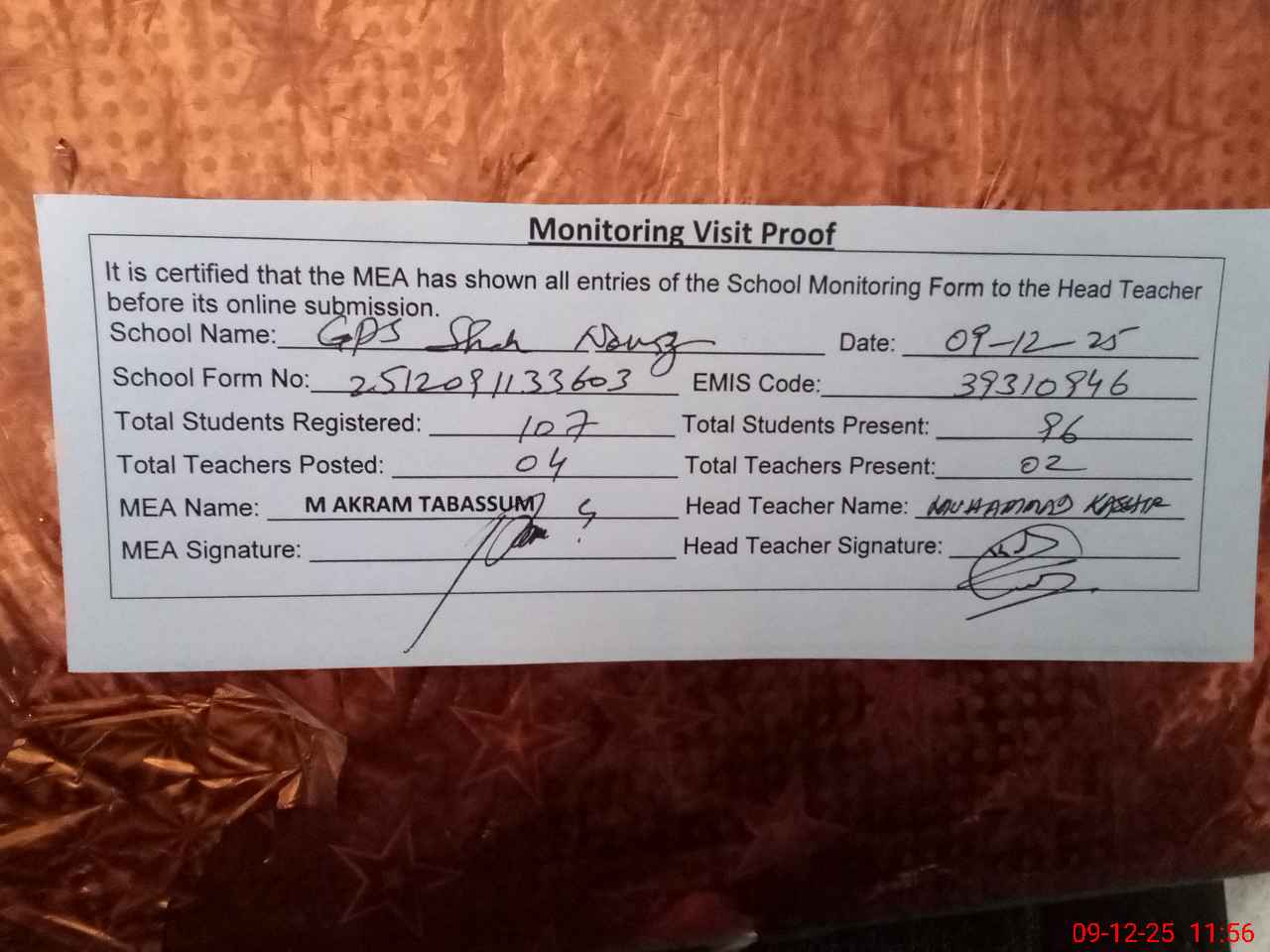 | Attendance Register | Head Teacher | MEA with School | Visit Proof |