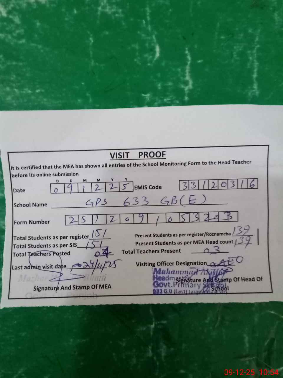 | Attendance Register | Head Teacher | MEA with School | Visit Proof |