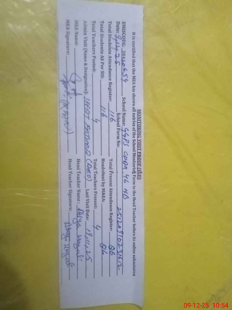 | Attendance Register | Head Teacher | MEA with School | Visit Proof |