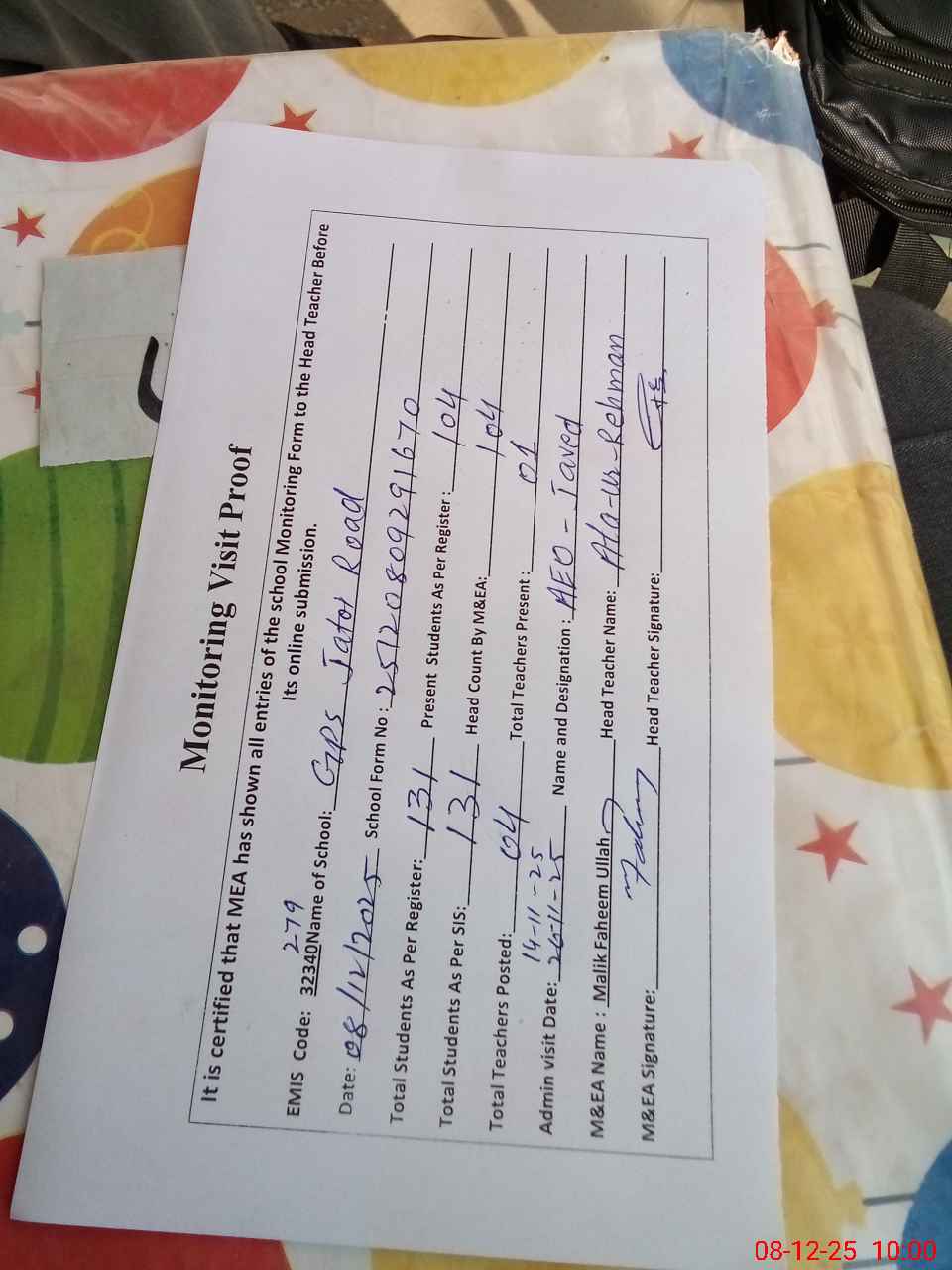 | Attendance Register | Head Teacher | MEA with School | Visit Proof |