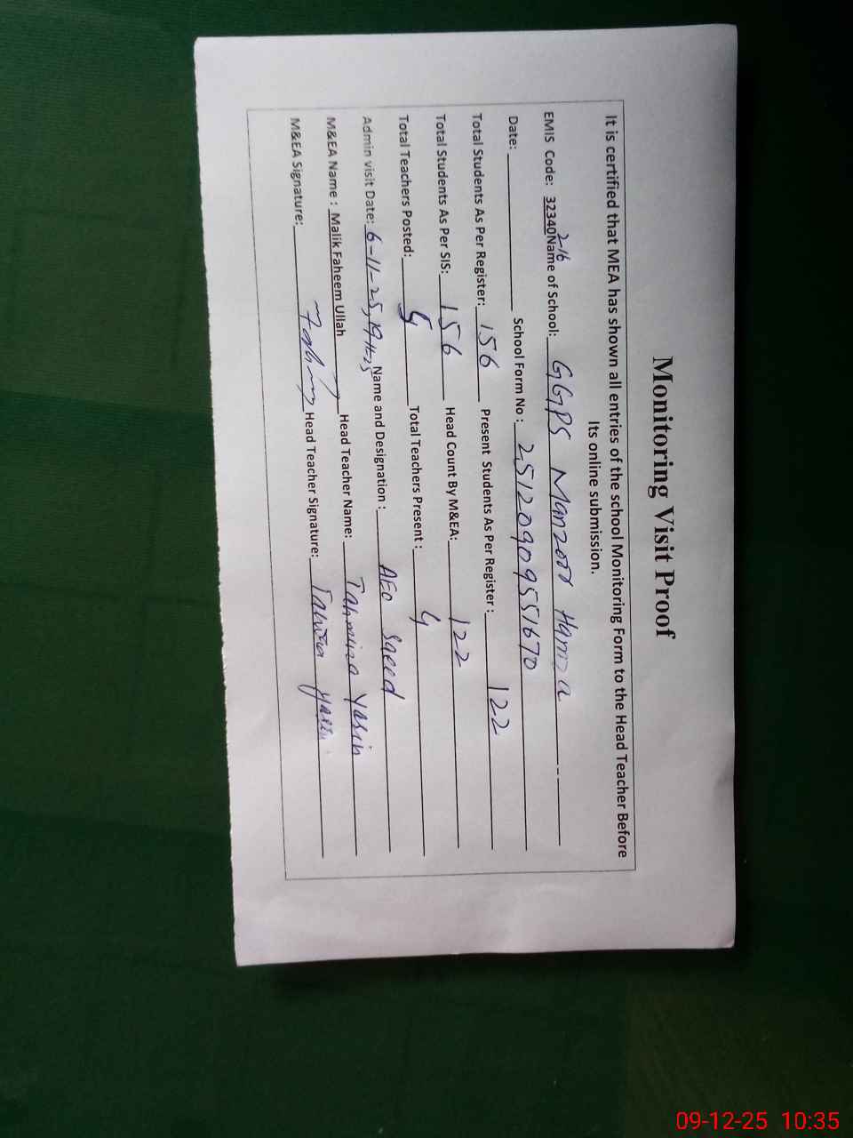 | Attendance Register | Head Teacher | MEA with School | Visit Proof |
