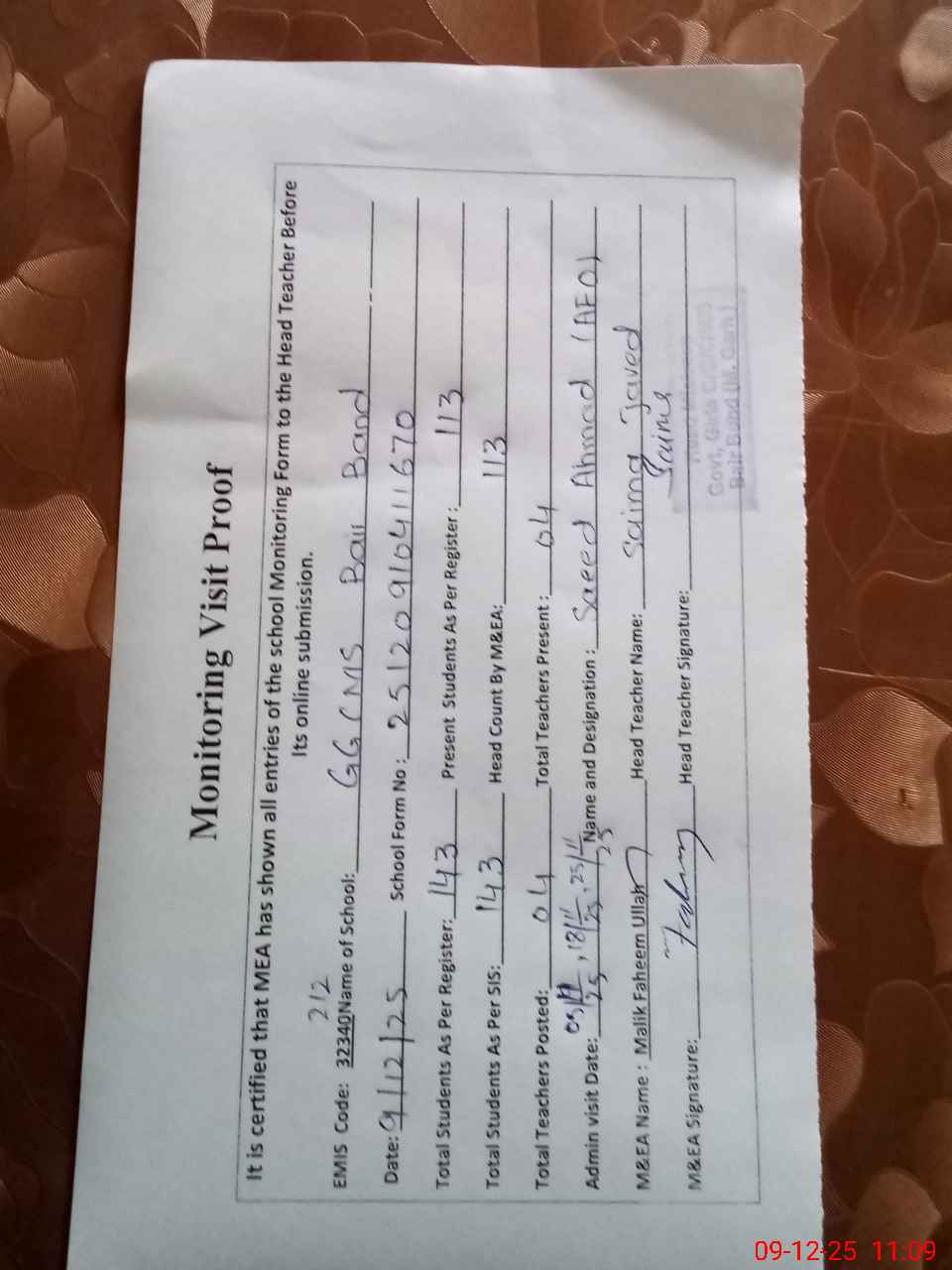 | Attendance Register | Head Teacher | MEA with School | Visit Proof |