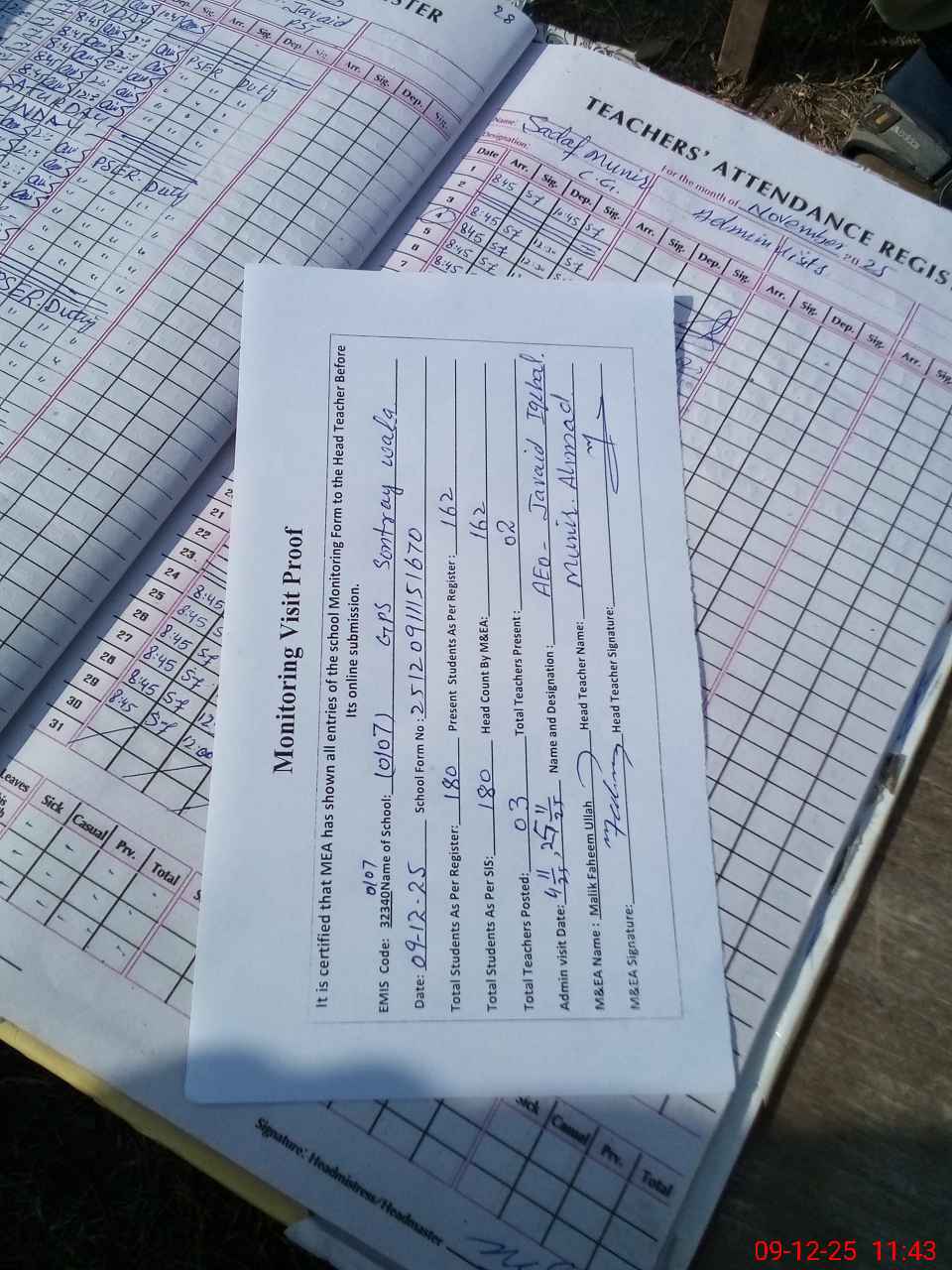 | Attendance Register | Head Teacher | MEA with School | Visit Proof |