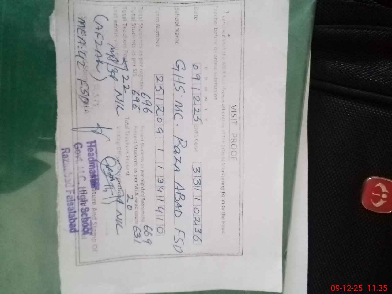 | Attendance Register | Head Teacher | MEA with School | Visit Proof |