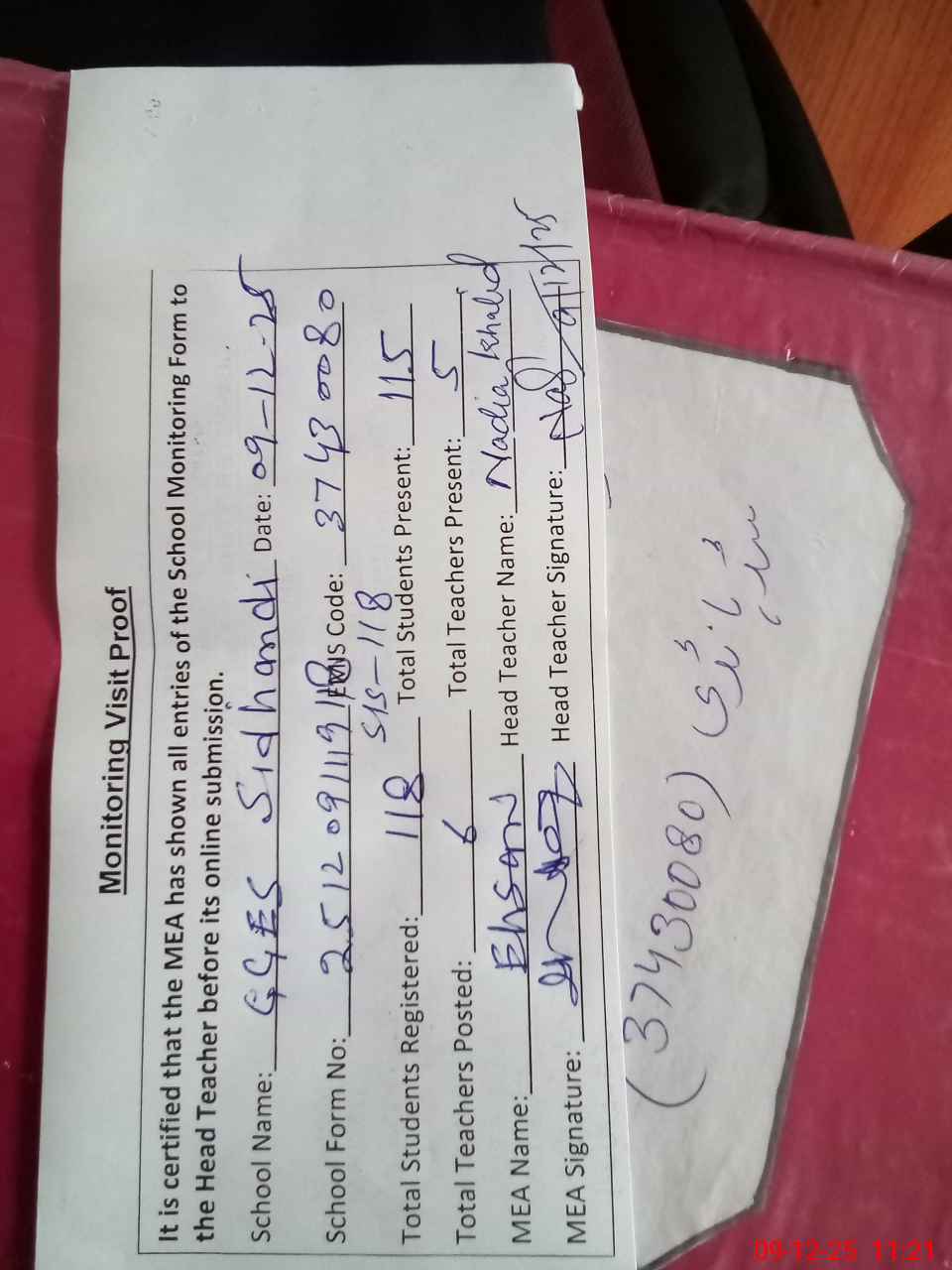 | Attendance Register | Head Teacher | MEA with School | Visit Proof |