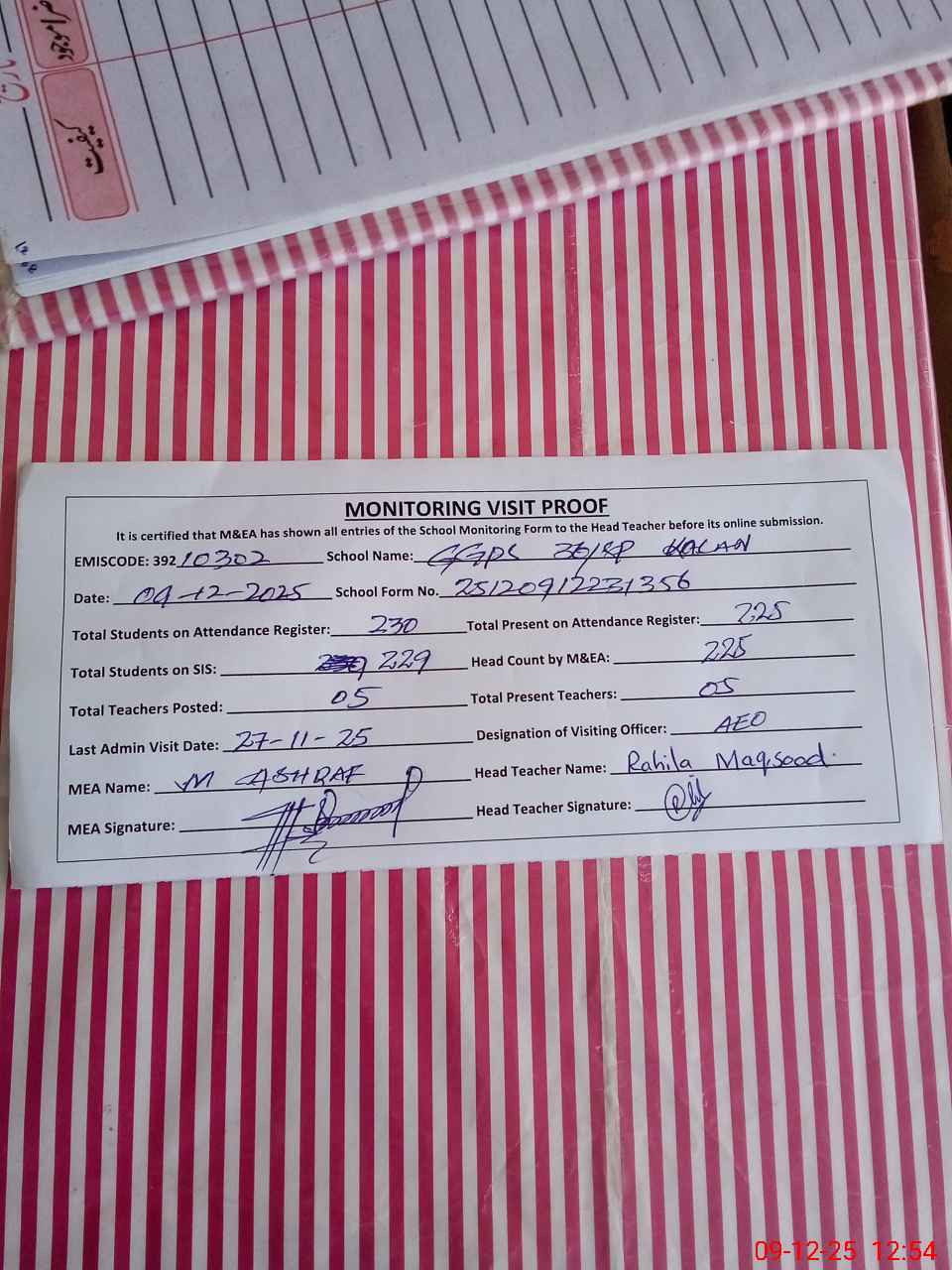 | Attendance Register | Head Teacher | MEA with School | Visit Proof |