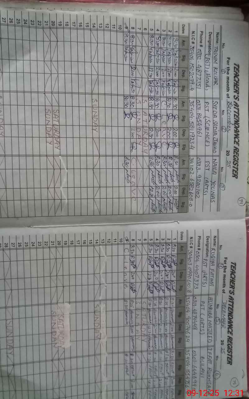 | CNIC | Full Name | Designation | R/C | Absence During Last Calender Month |