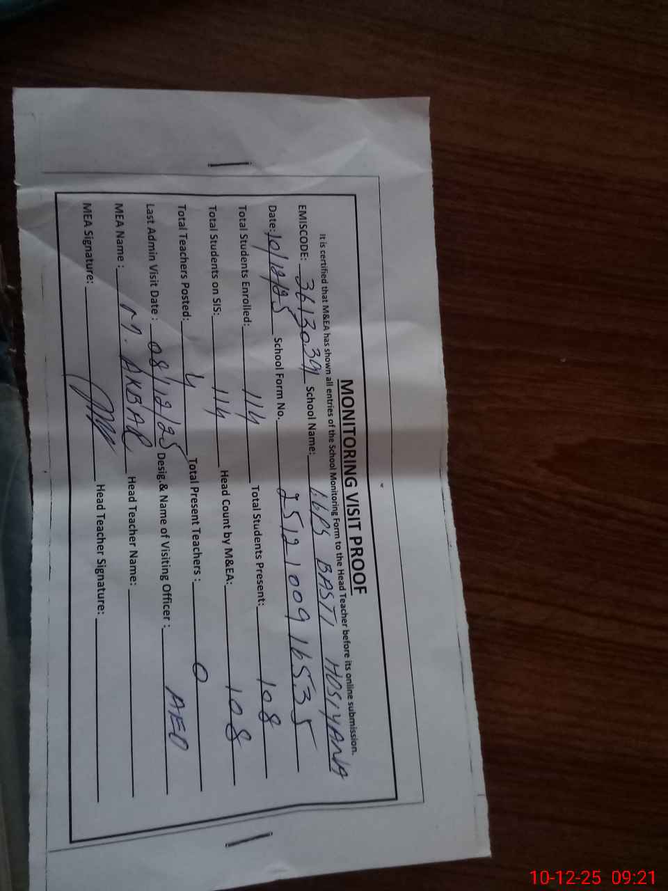 | Attendance Register | Head Teacher | MEA with School | Visit Proof |