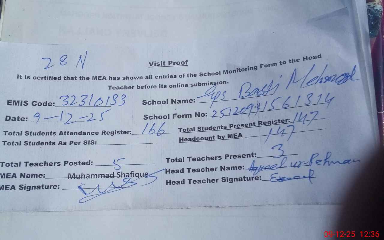 | Attendance Register | Head Teacher | MEA with School | Visit Proof |