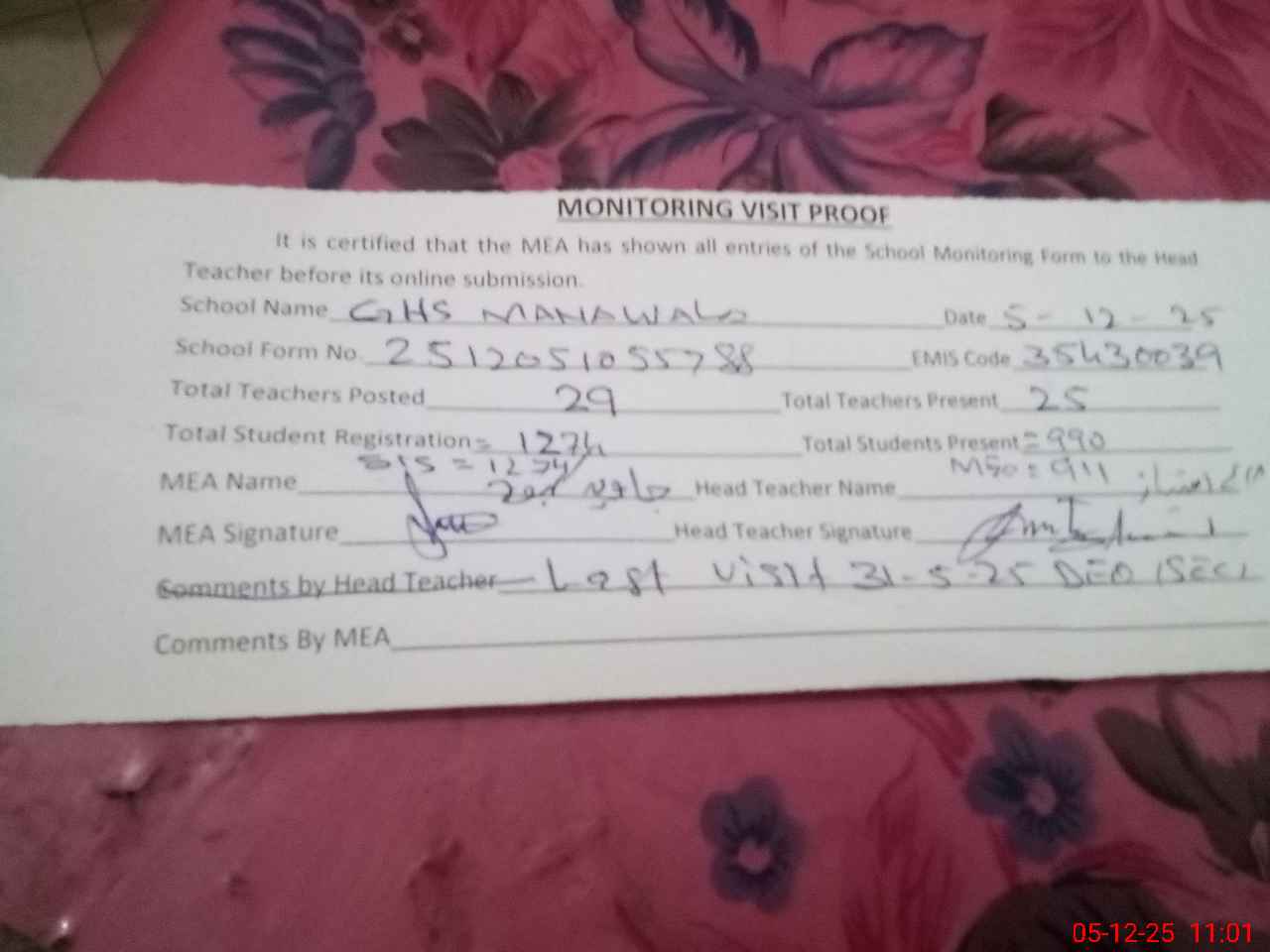 | Attendance Register | Head Teacher | MEA with School | Visit Proof |