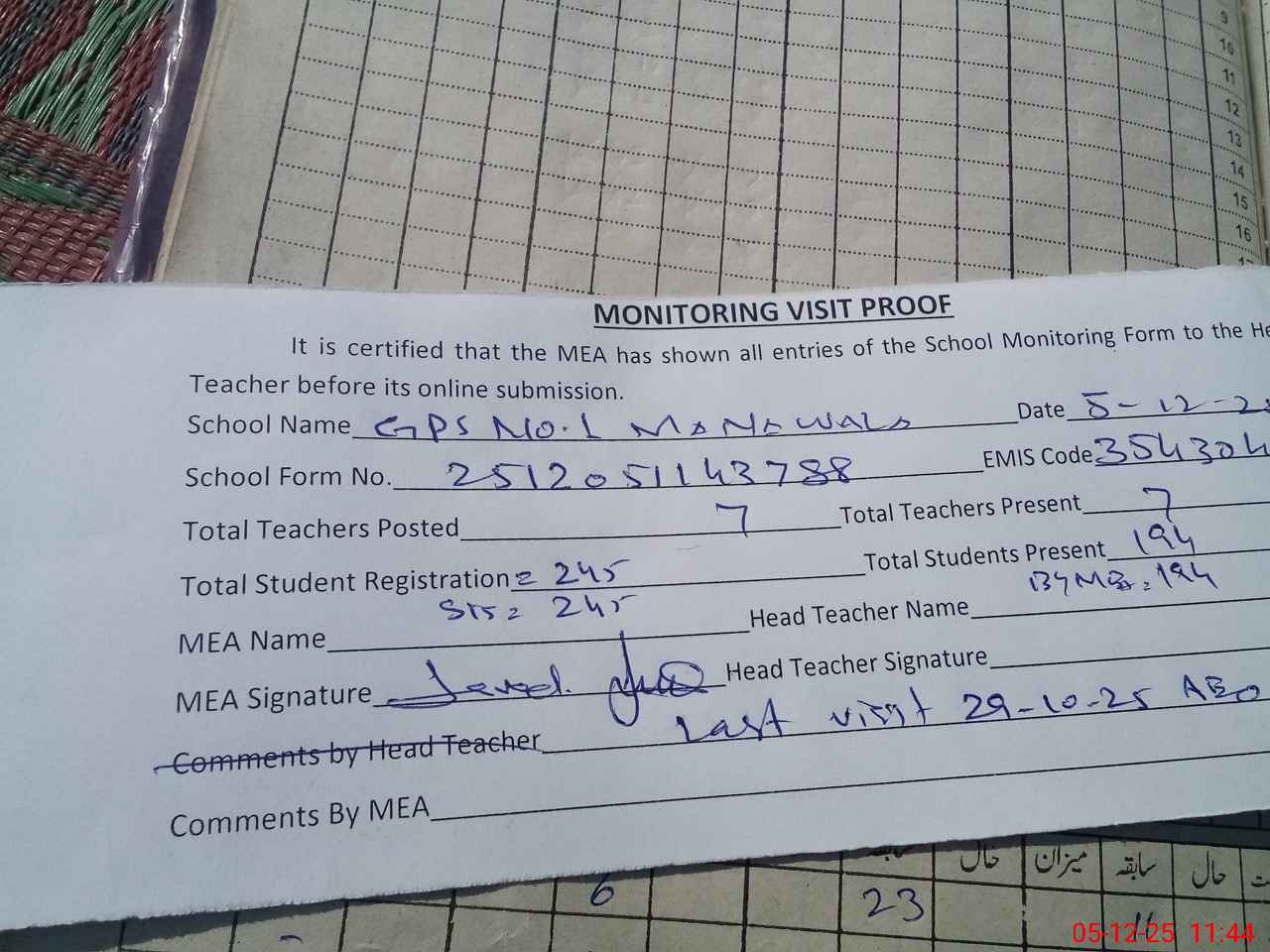| Attendance Register | Head Teacher | MEA with School | Visit Proof |