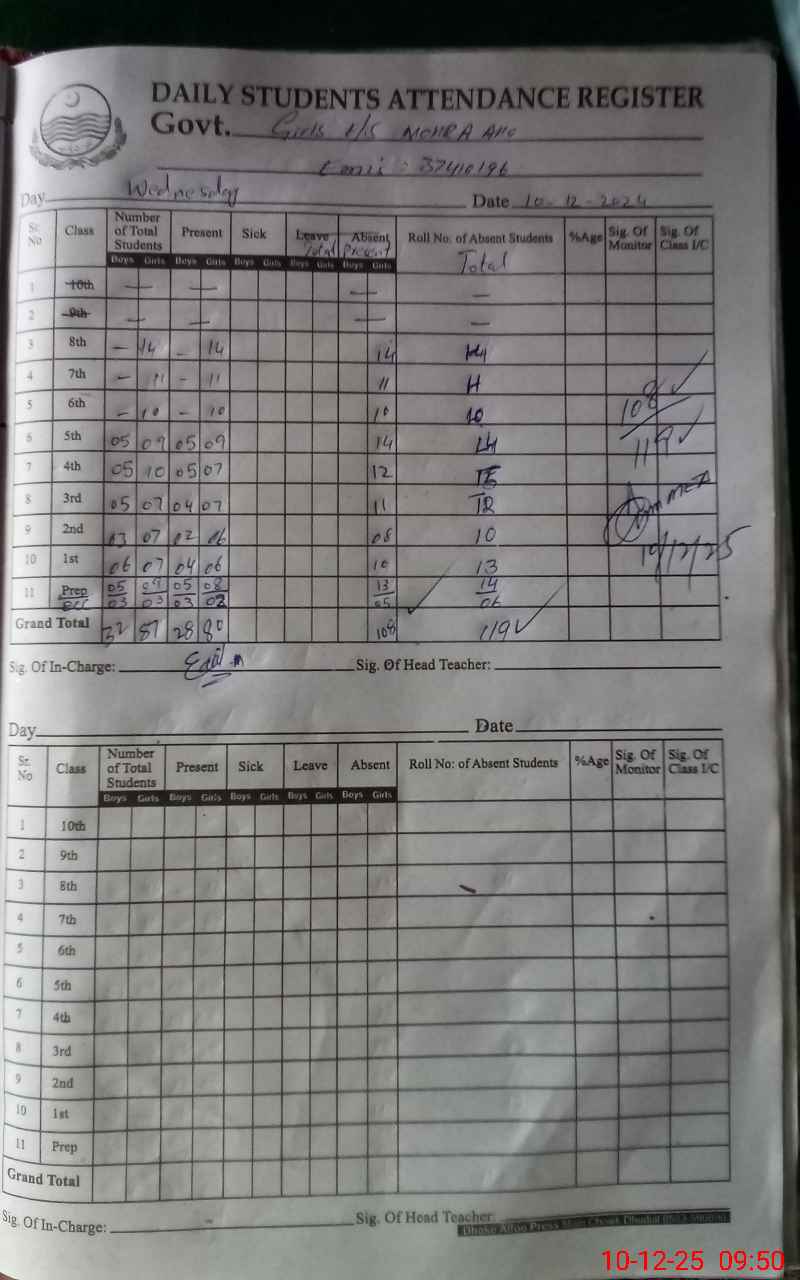 | No. of Students Present - Female | 0 | 2 | 6 | 6 | 7 | 9 | 7 | 10 | 11 | 14 | 80 | |||||
