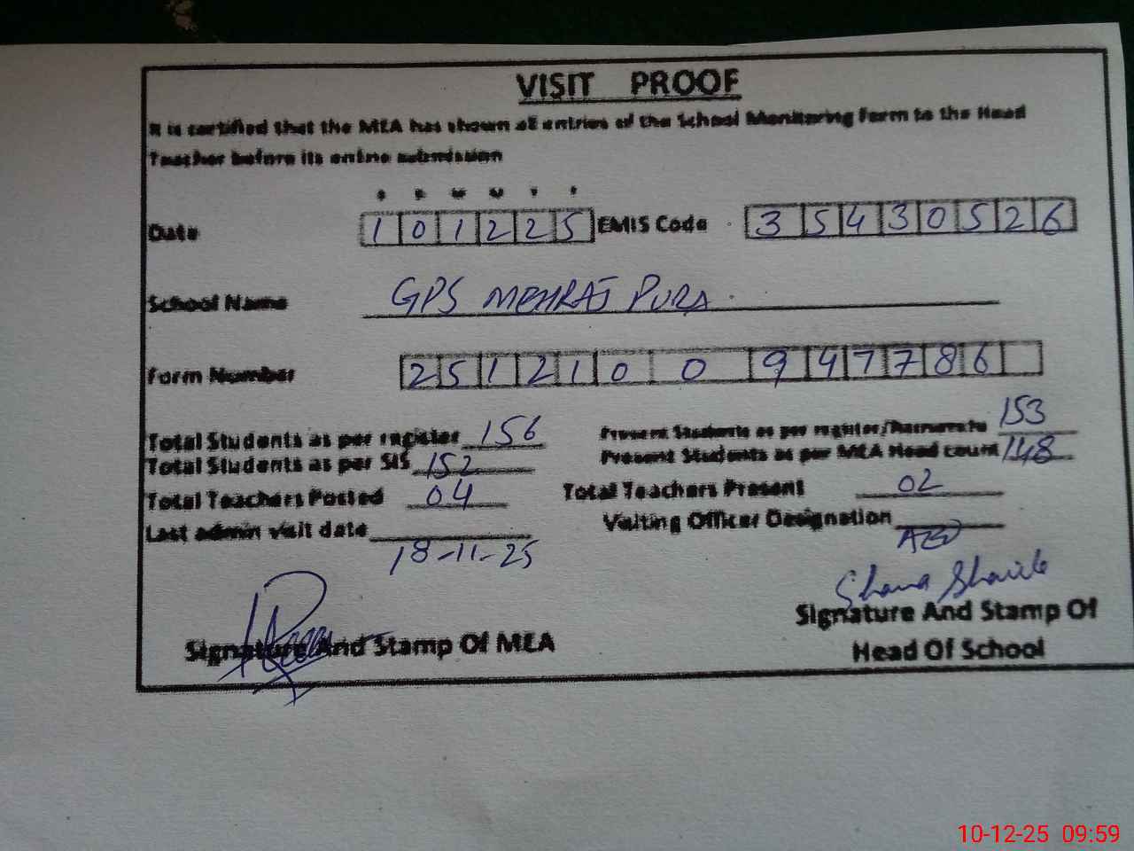 | Attendance Register | Head Teacher | MEA with School | Visit Proof |