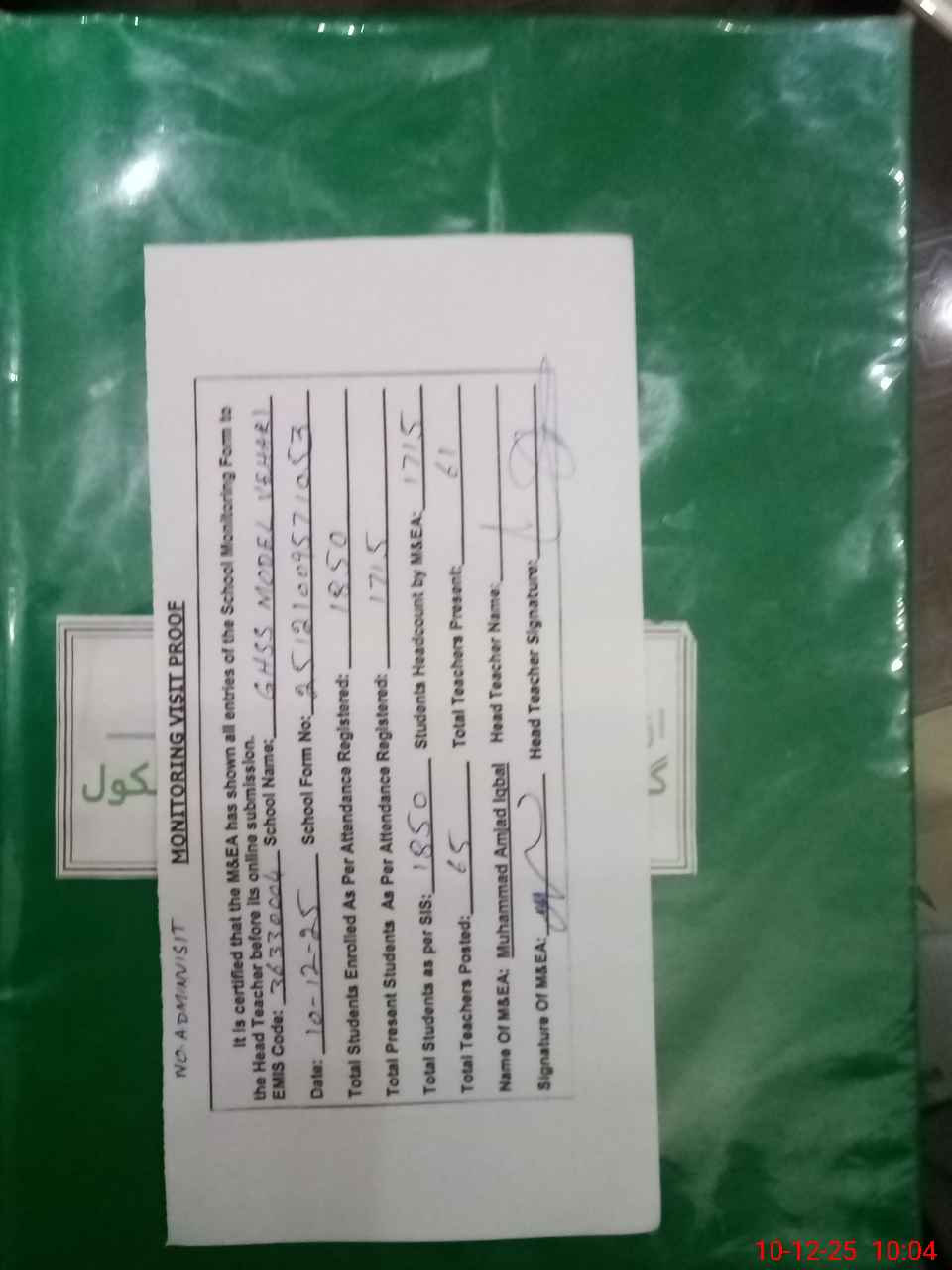 | Attendance Register | Head Teacher | MEA with School | Visit Proof |