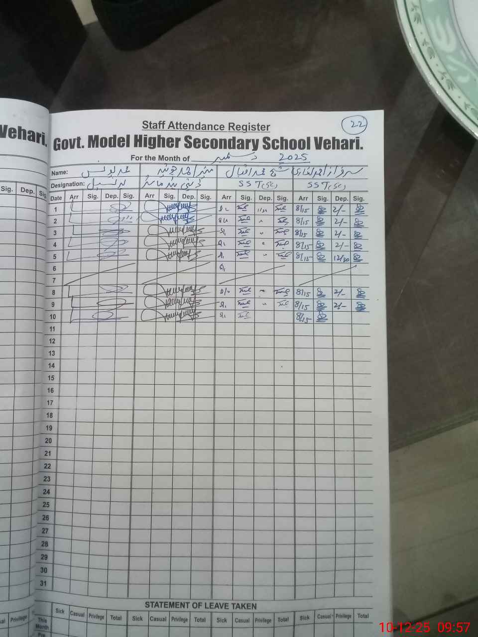 | CNIC | Full Name | Designation | R/C | Absence During Last Calender Month |