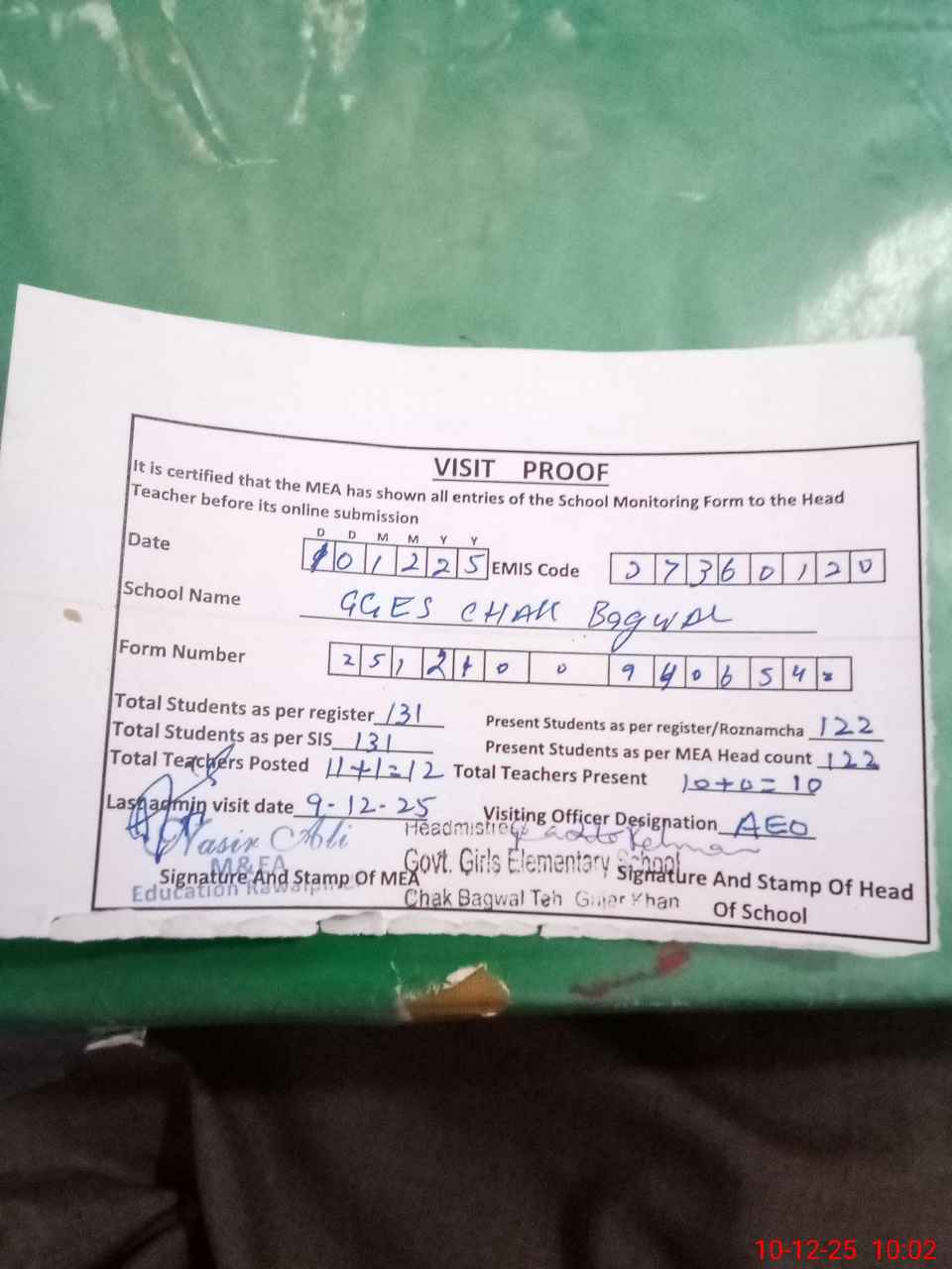 | Attendance Register | Head Teacher | MEA with School | Visit Proof |