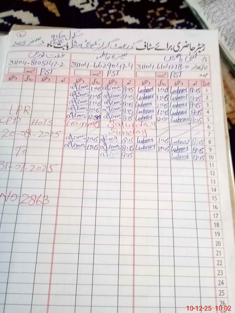 | CNIC | Full Name | Designation | R/C | Absence during last cal. month |