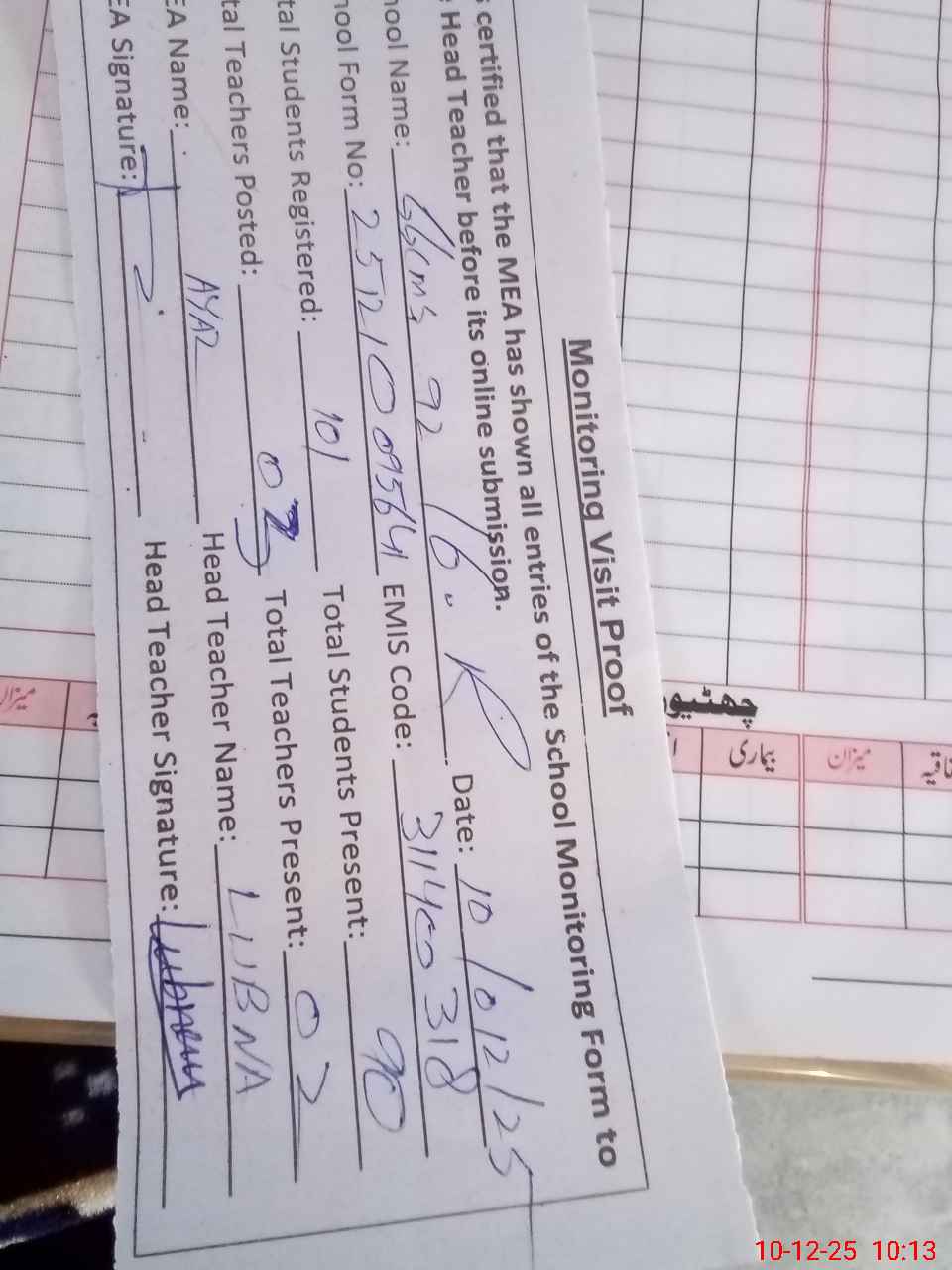 | Attendance Register | Head Teacher | MEA with School | Visit Proof |