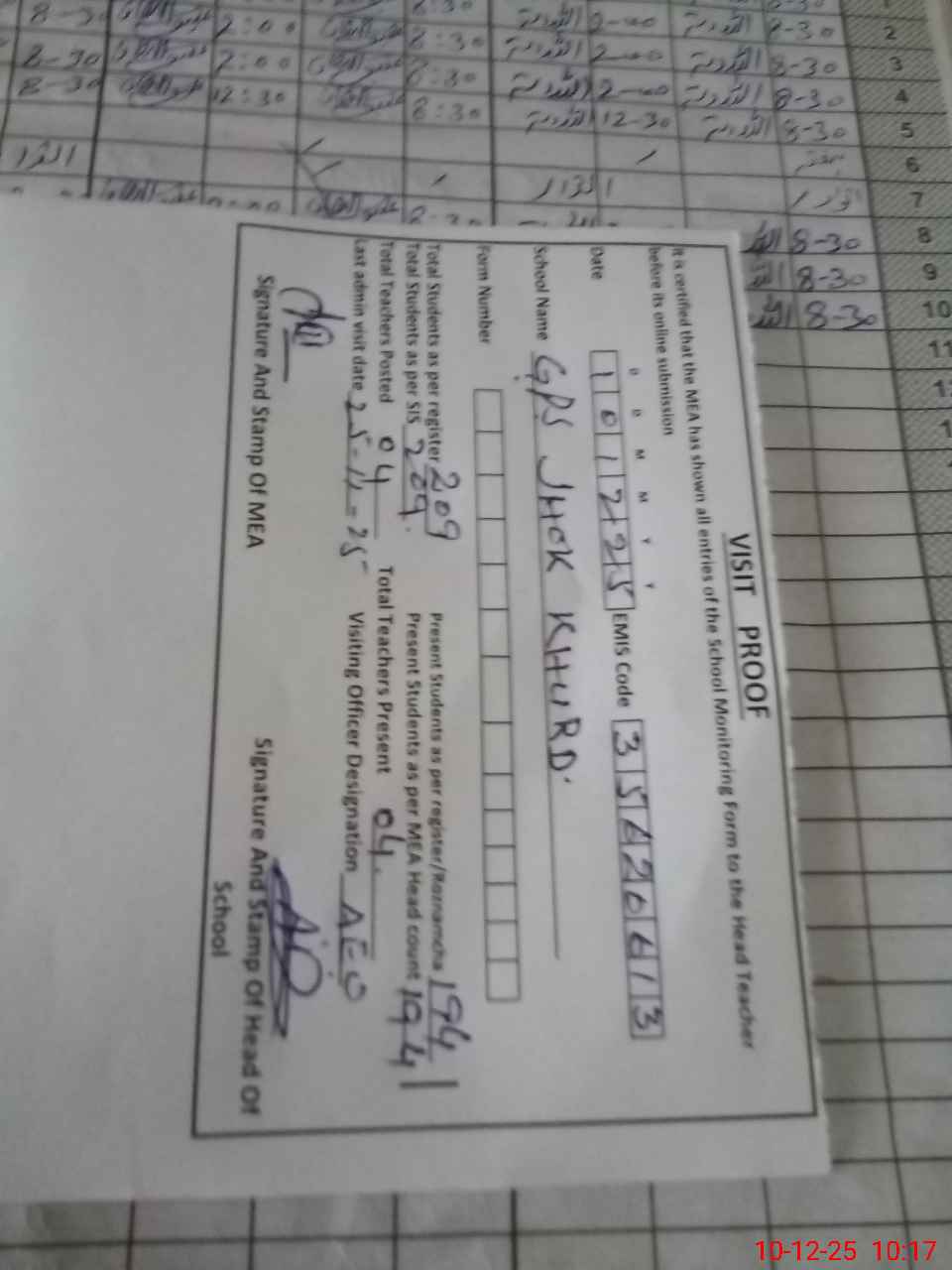 | Attendance Register | Head Teacher | MEA with School | Visit Proof |