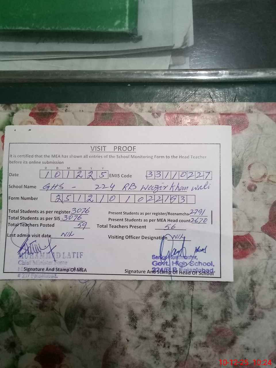| Certified that this School was Inspected by the Undersigned MEA/DMO Today and the Information Stated Above is as Per Record. | |||||