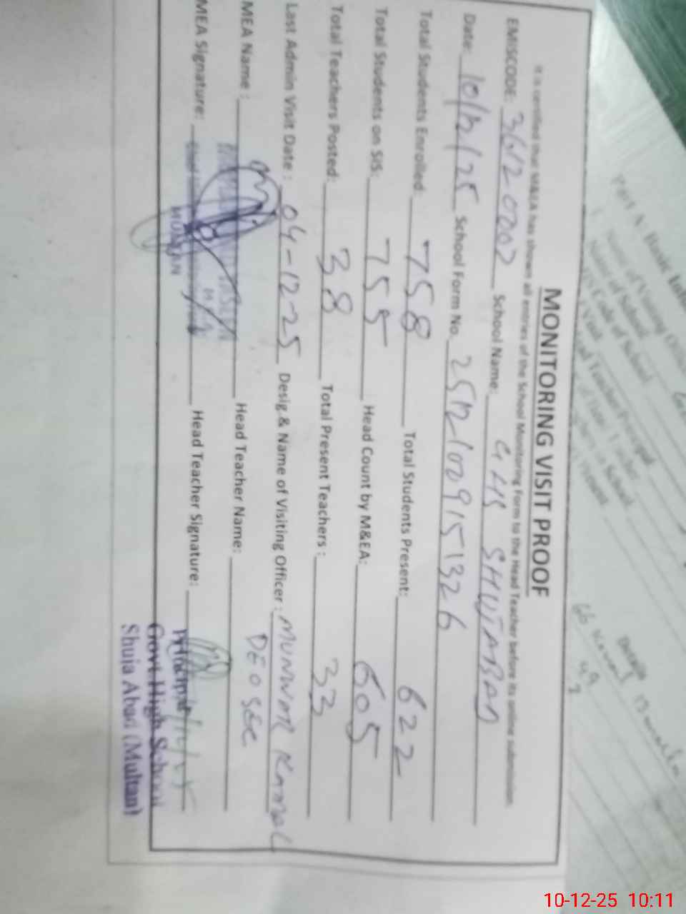 | Certified that this School was Inspected by the Undersigned MEA/DMO Today and the Information Stated Above is as Per Record. | |||||