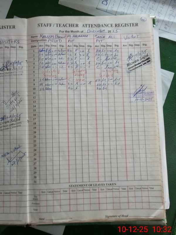 | Remarks (Use Separate Page if Required): Attendance of teaching staff and students on SIS Software is not updated Data as per provided by School Staff and found during physical visit | |||||