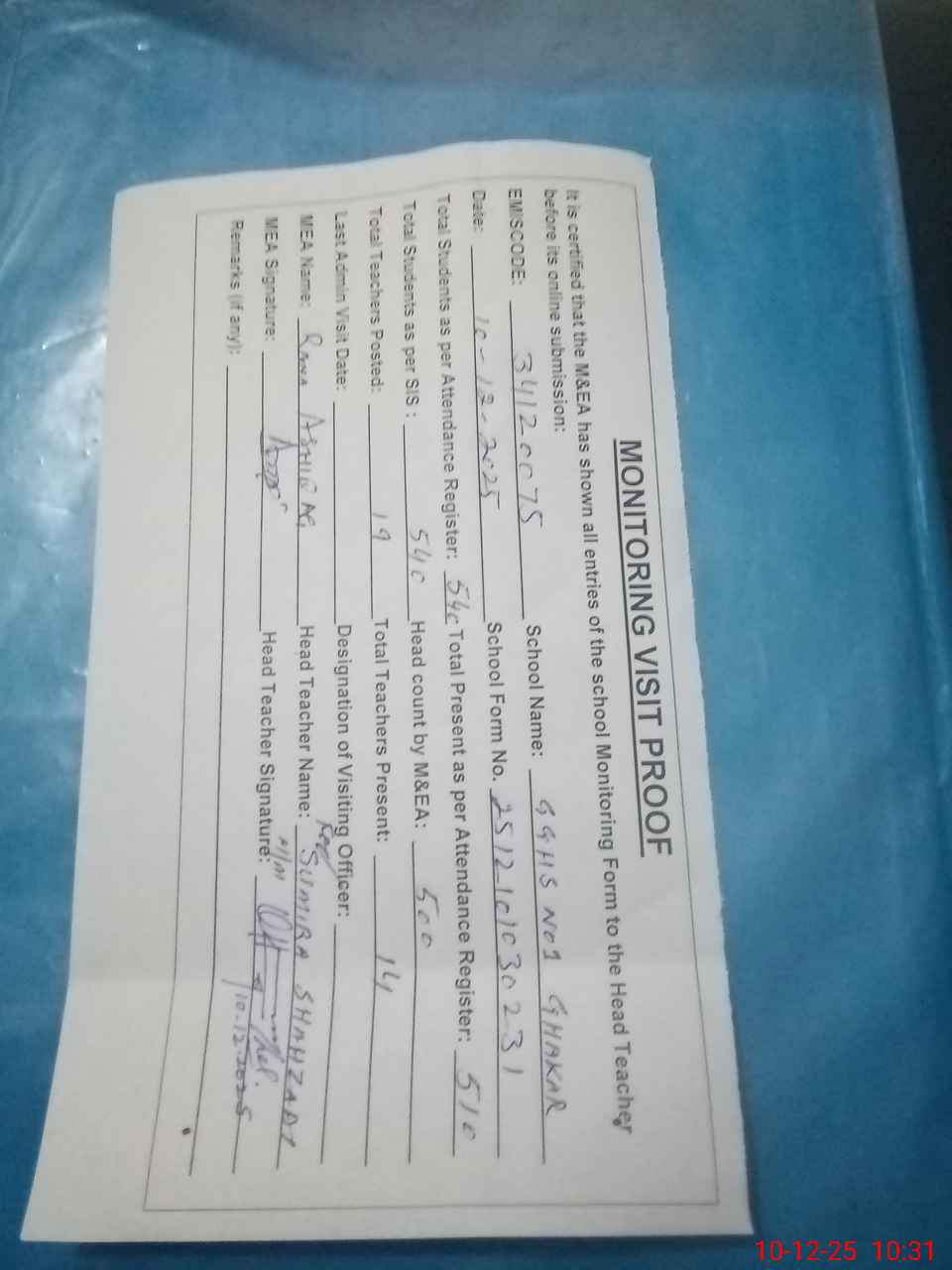 | Attendance Register | Head Teacher | MEA with School | Visit Proof |