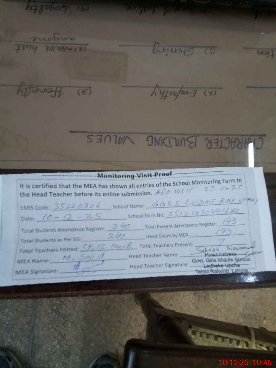 | Certified that this School was Inspected by the Undersigned MEA/DMO Today and the Information Stated Above is as Per Record. | |||||