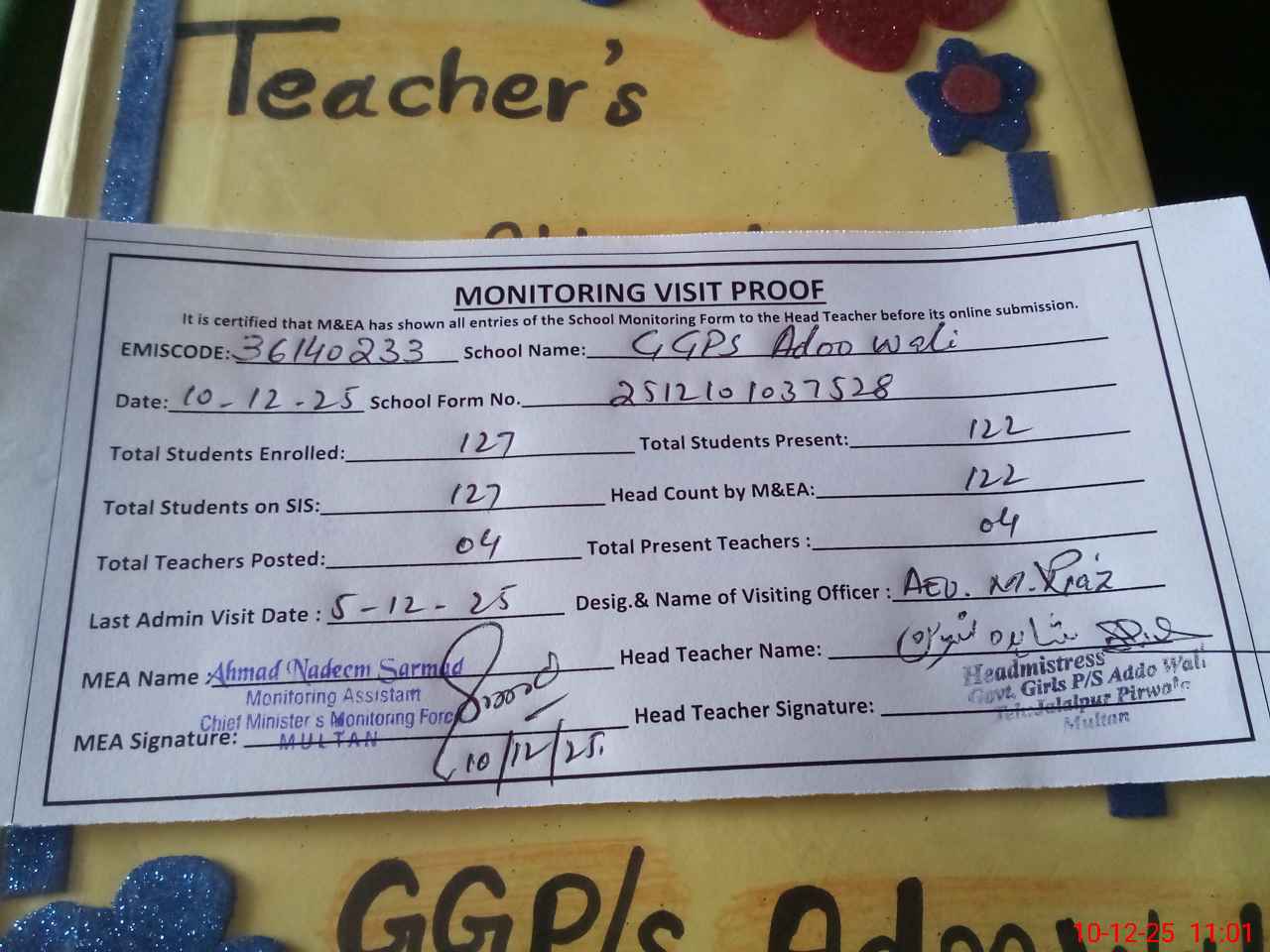 | Attendance Register | Head Teacher | MEA with School | Visit Proof |
