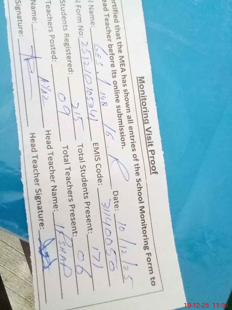 | Name: NA**** SA**** Designation: (School Headmaster's/Headmistress's) SST ( G) Phone/Cell Number: 03**** |