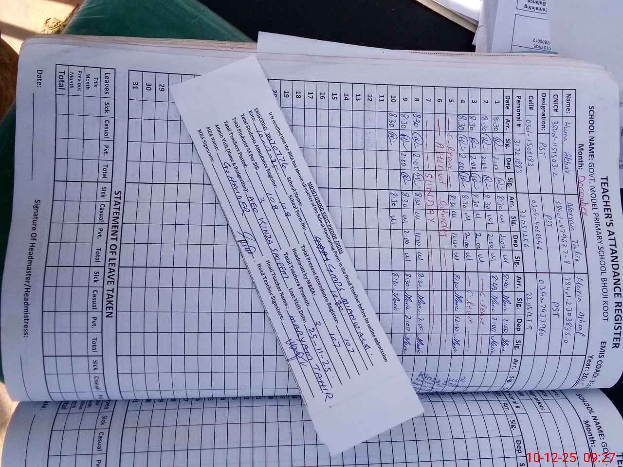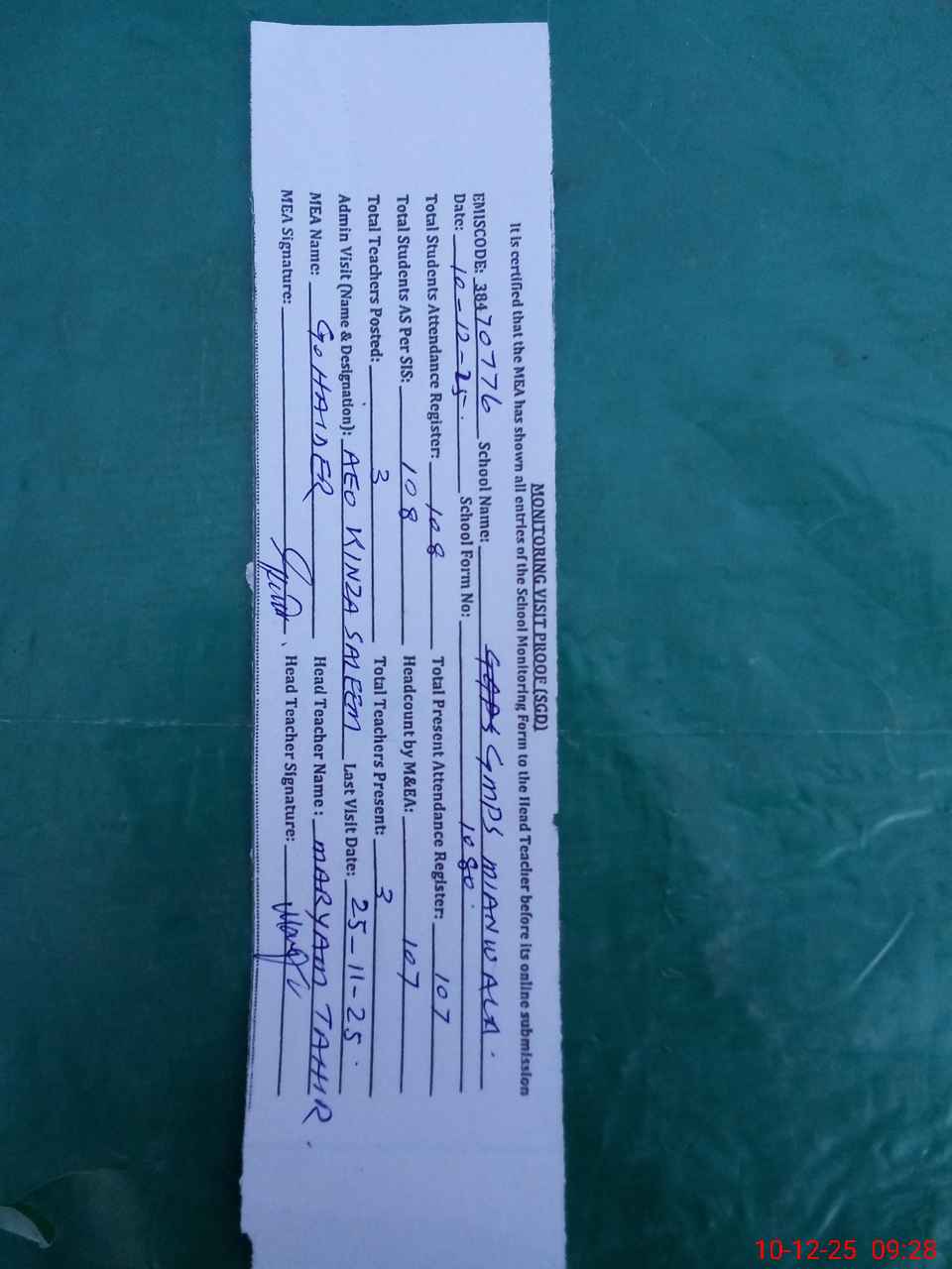 | Attendance Register | Head Teacher | MEA with School | Visit Proof |