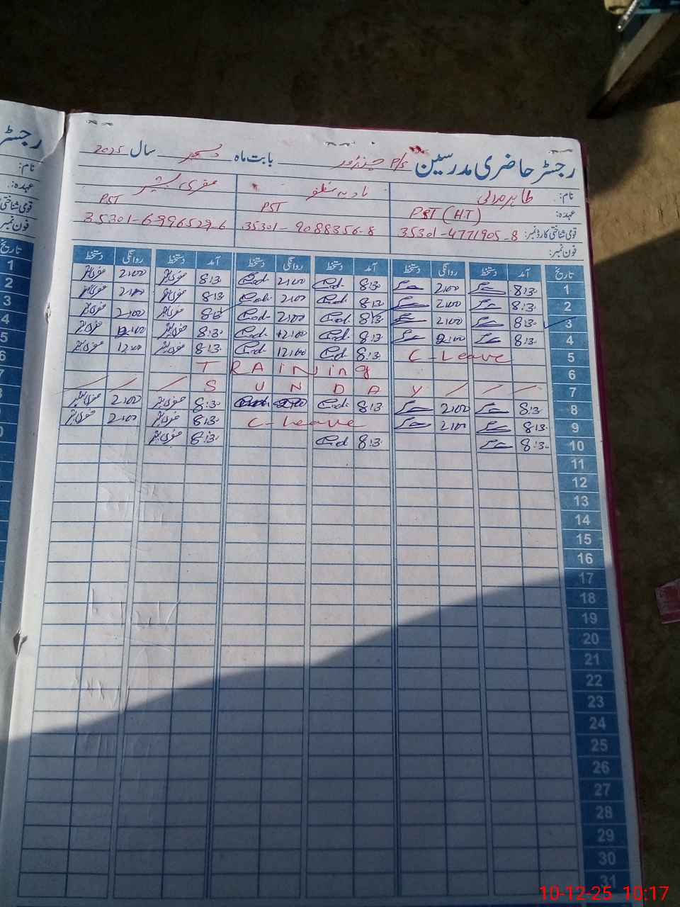 | CNIC | Full Name | Designation | R/C | Absence During Last Calender Month |