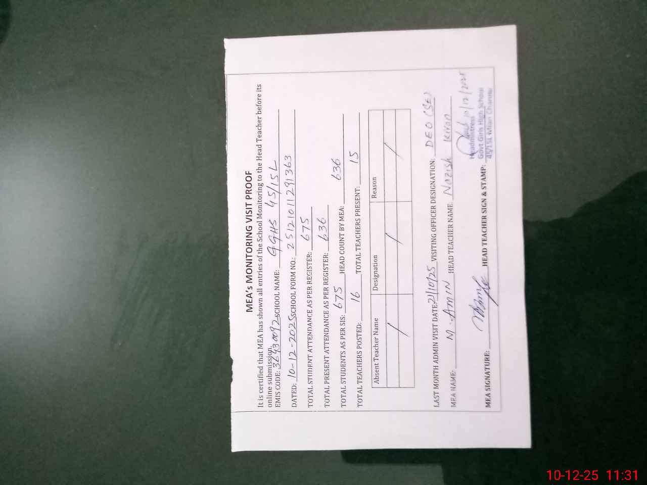 | Attendance Register | Head Teacher | MEA with School | Visit Proof |