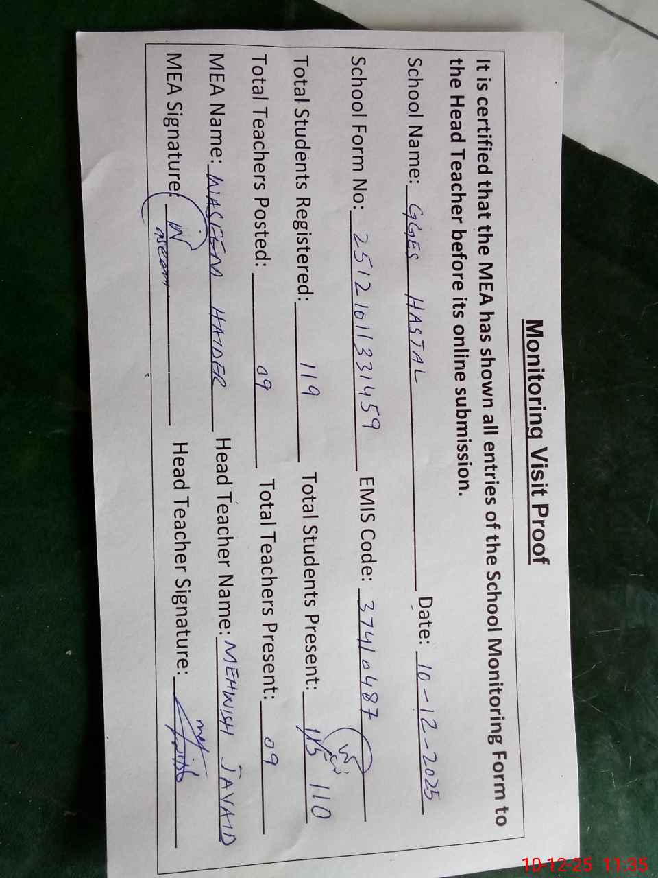 | Attendance Register | Head Teacher | MEA with School | Visit Proof |