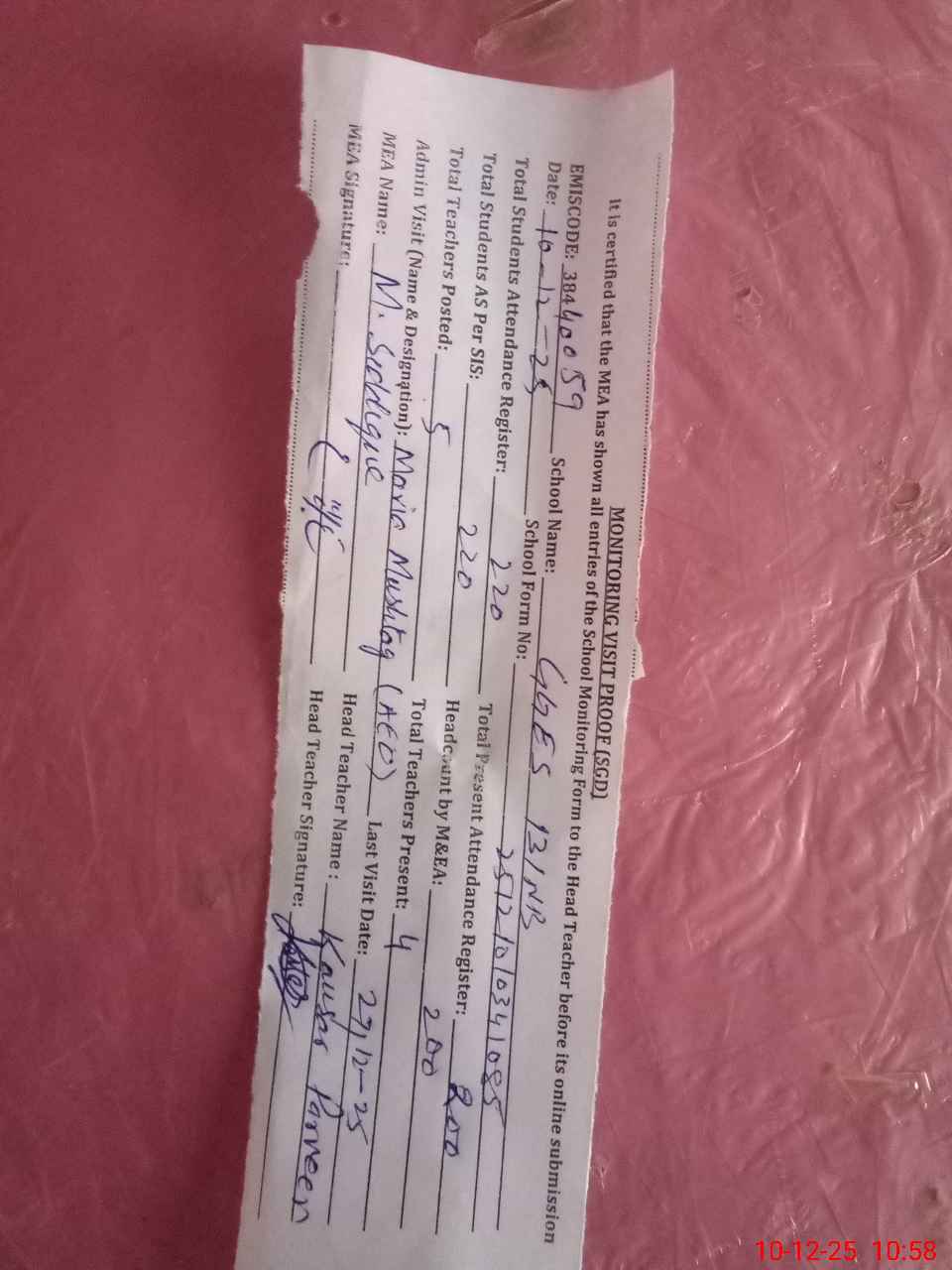 | Attendance Register | Head Teacher | MEA with School | Visit Proof |