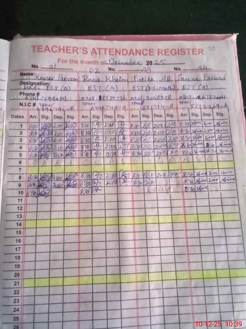 | CNIC | Full Name | Designation | R/C | Absence during last cal. month |