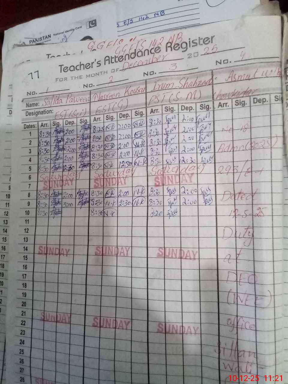 | CNIC | Full Name | Designation | R/C | Absence During Last Calender Month |
