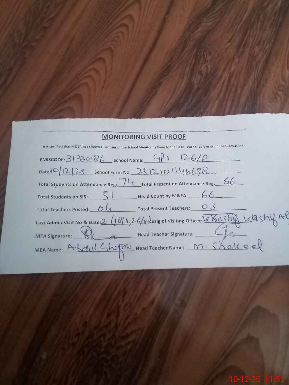 | Attendance Register | Head Teacher | MEA with School | Visit Proof |