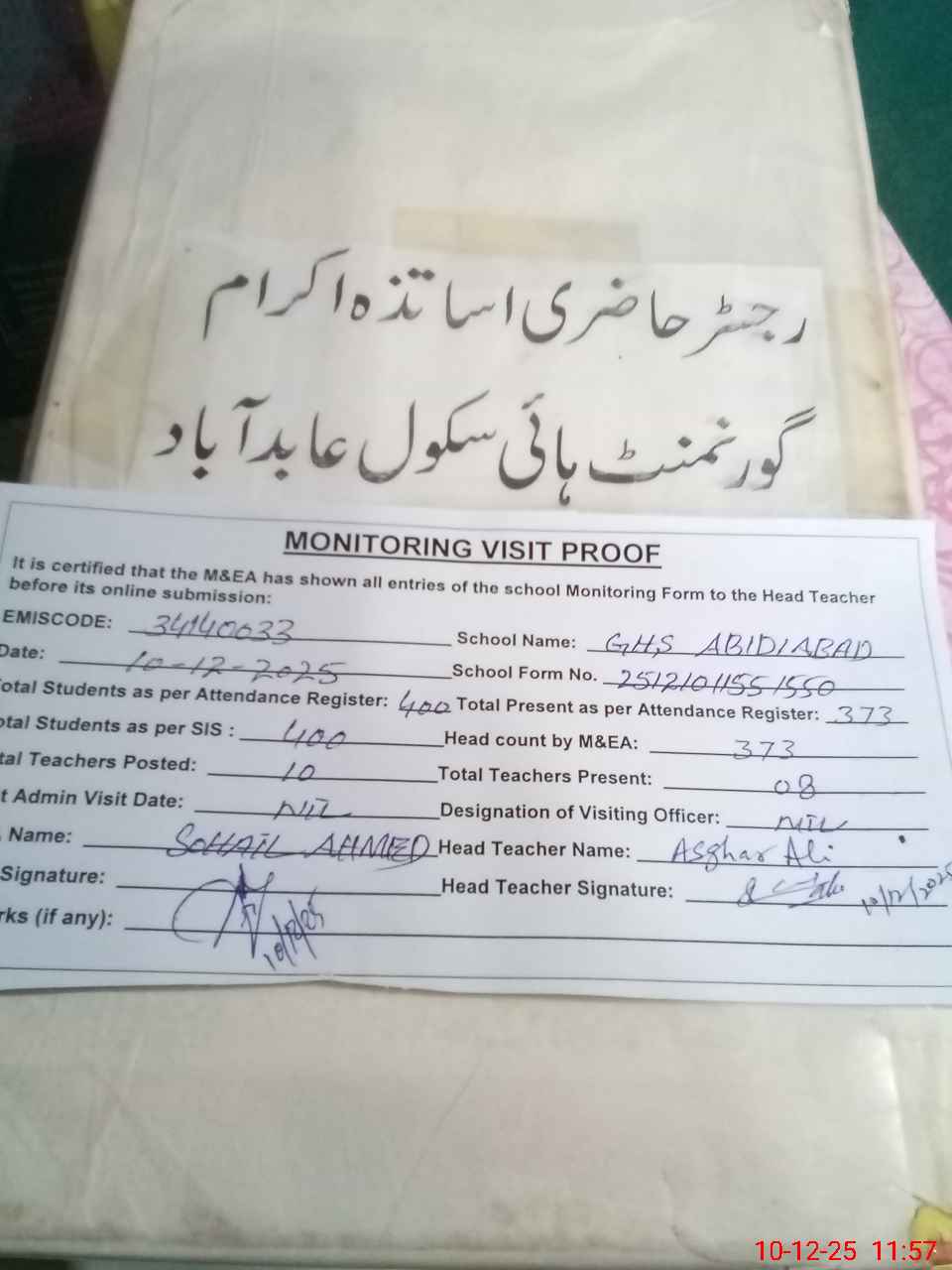 | EMIS Code: 34140033 | Name of School: GHS ABID ABAD | |||