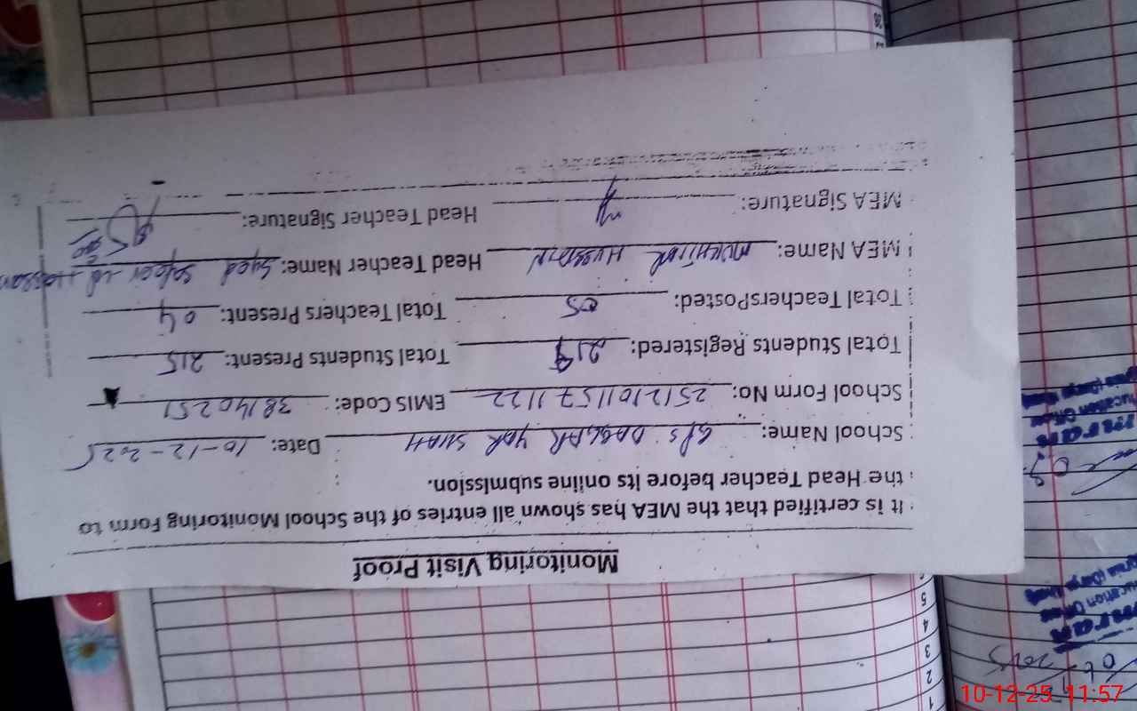 | Attendance Register | Head Teacher | MEA with School | Visit Proof |